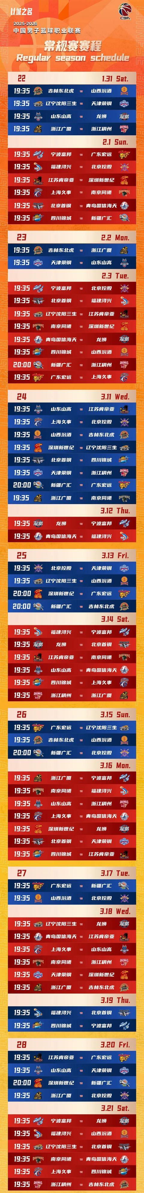 北京时间10月20日,CBA官方公布了2025-2026赛季CBA联赛常规赛赛程,新赛季的CBA将于12月12日开赛,次年4月24日收官,具体赛程公布如下。(注:由于目前新赛季球队全简称尚未确定,对阵表中球队名称暂用俱乐部简称代替。)