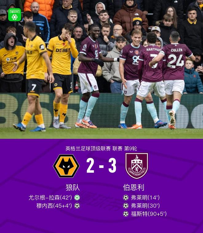 北京时间10月26日英格兰足球顶级联赛 联赛 第9轮,狼队主场对阵伯恩利。狼队尤尔根-拉森破门,穆内西破门。伯恩利弗莱明梅开二度,福斯特破门。最终比分狼队 2-3 伯恩利。