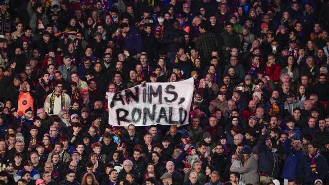 在诺坎普球场,球迷们在阿劳霍因个人原因决定暂时休息后的首场比赛中,表达了对他的支持。看台上出现了多条为这位乌拉圭中卫打气的横幅,显示出球迷们与他站在一起。