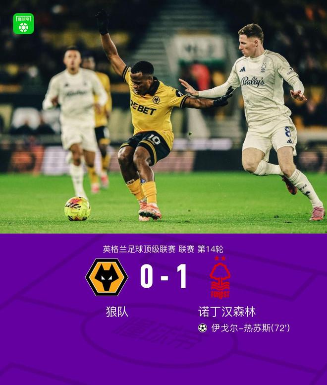 英超开局14轮不胜+8连败!狼队0-1森林,伊戈尔-热苏斯破门